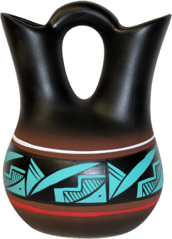 CINDY BLACKHORSE presents red, white and turquoise accents in contemporary geometric designs over a earthtone finish. Although each piece follows the master pattern each is a unique hand painted creation.