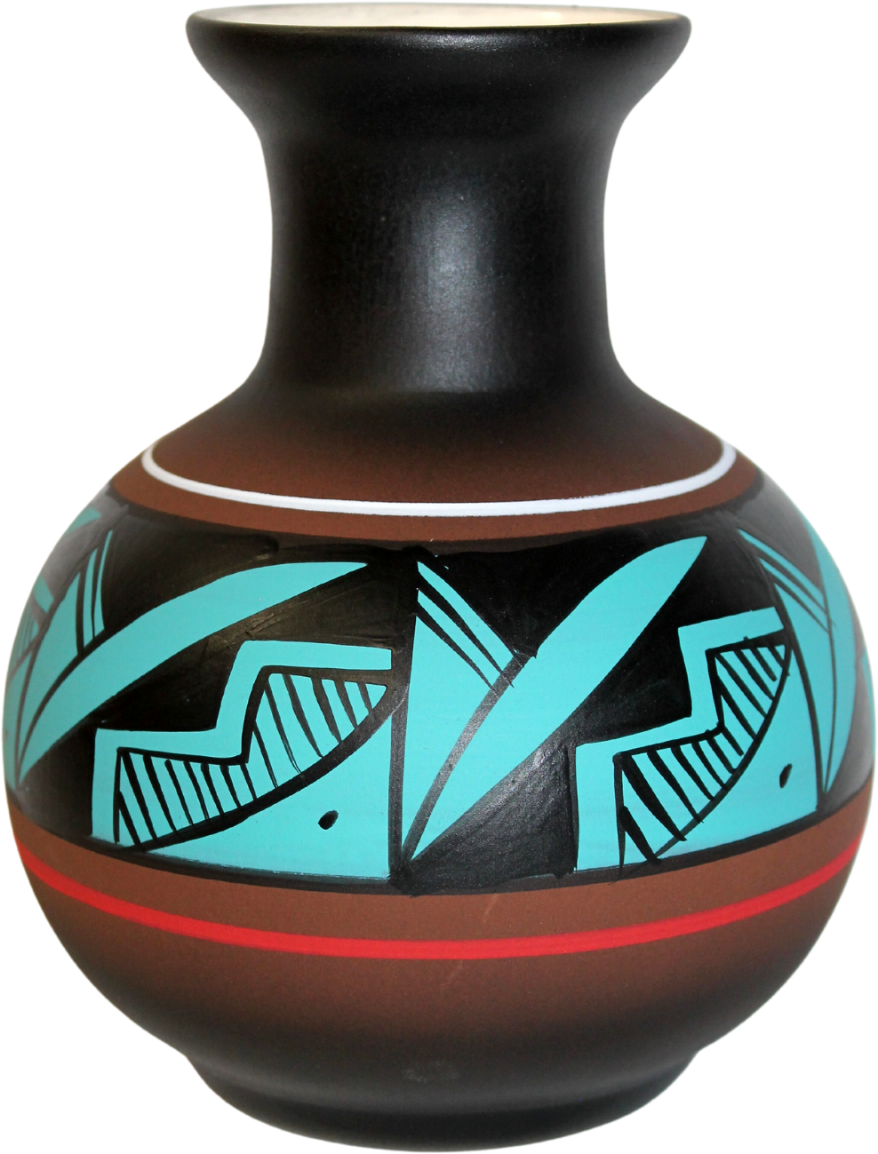 CINDY BLACKHORSE presents red, white and turquoise accents in contemporary geometric designs over a earthtone finish. Although each piece follows the master pattern each is a unique hand painted creation.