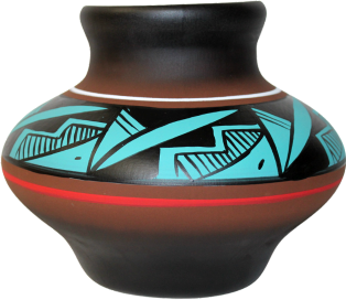 CINDY BLACKHORSE presents red, white and turquoise accents in contemporary geometric designs over a earthtone finish. Although each piece follows the master pattern each is a unique hand painted creation.