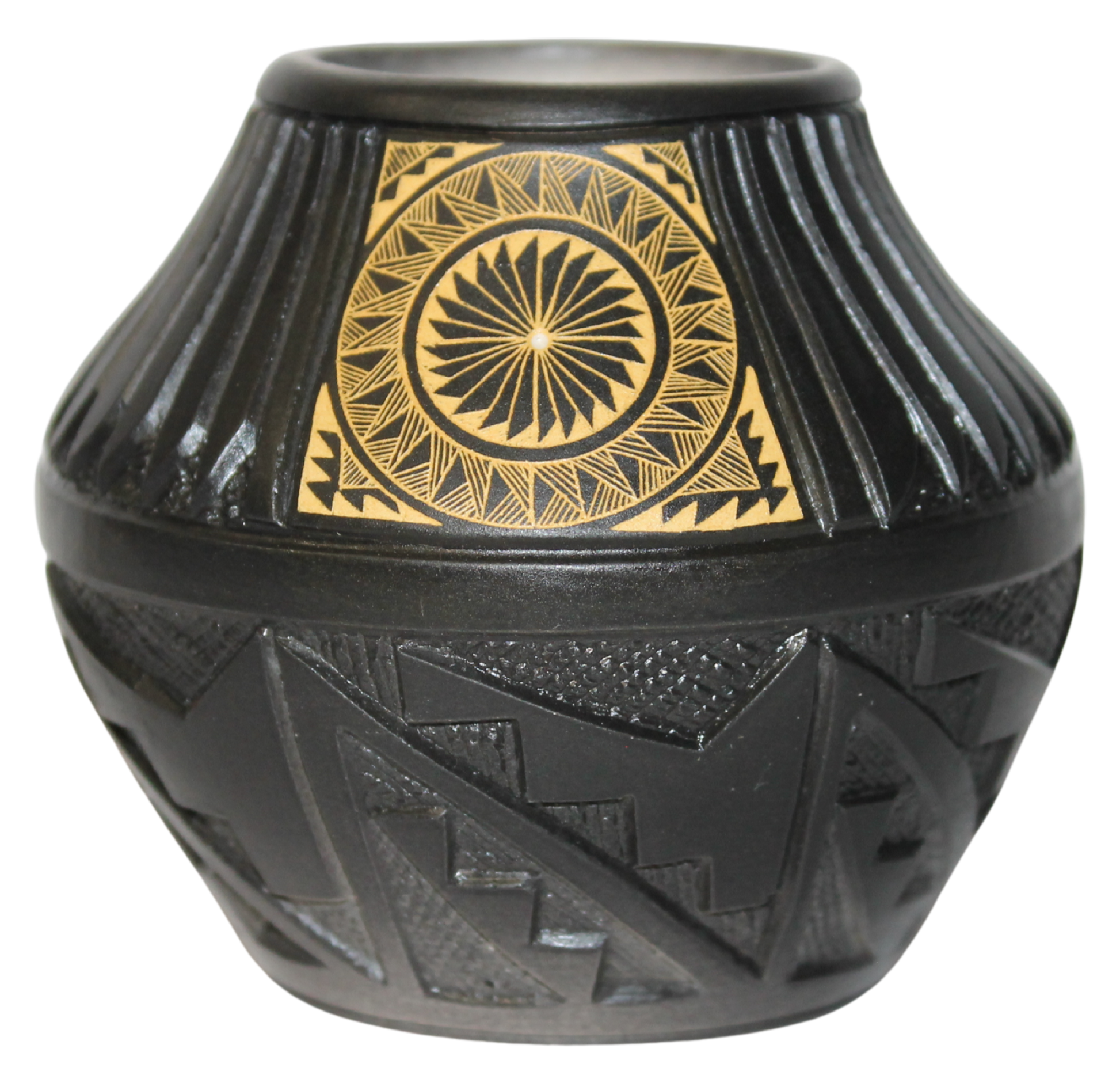 LEO BLACKHORSE specializes in ultra fine etching and two-tone etching. This mini vase features both ultra fine two-tone and deep etching giving it a particularly rich feel. The contemporary geometric patterns draw on several traditional designs including feather, steps, rain and a variety of spiral shapes.