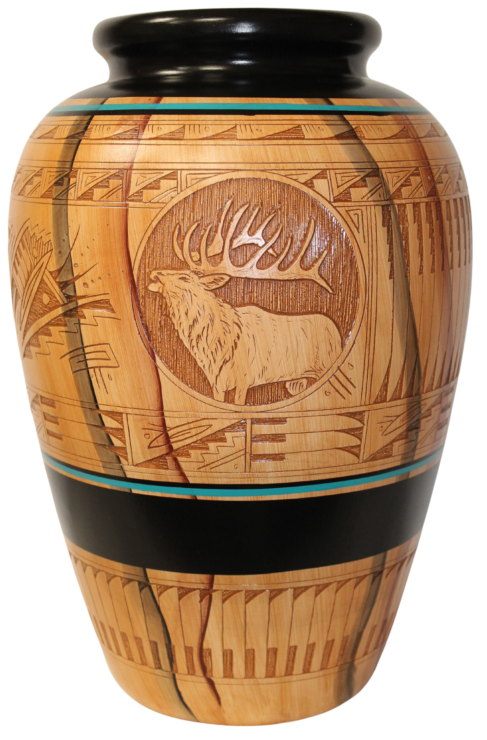 DWAYNE BLACKHORSE has done a variety of pottery styles but his specialty is this Woodgrain Finish. Greenware is etched, fired and then streaked with the woodgrain pattern with turquoise accent on many of his pieces. Although many are similar each piece is unique. This piece features TWO panels, Eagle in Flight and Elk