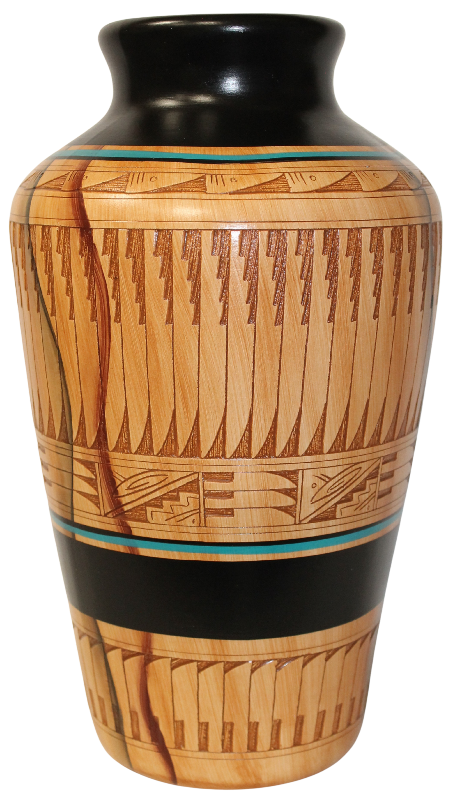 DWAYNE BLACKHORSE has done a variety of pottery styles but his specialty is this Woodgrain Finish. Greenware is etched, fired and then streaked with the woodgrain pattern with turquoise accent on many of his pieces. Although many are similar each piece is unique. This piece features Hummingbird and a Feather pattern.