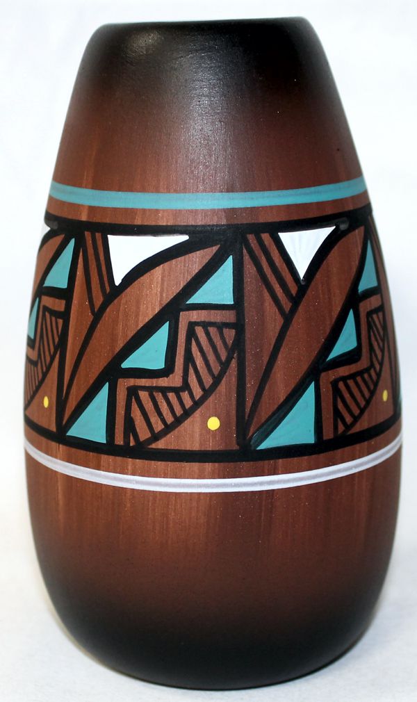 CINDY BLACKHORSE presents white and turquoise accents in contemporary geometric designs over a rich dark streaked finish. Greenware is fired and then streaked to form the background for Cindy's design work. Although each piece follows the master pattern each is a unique hand painted creation.