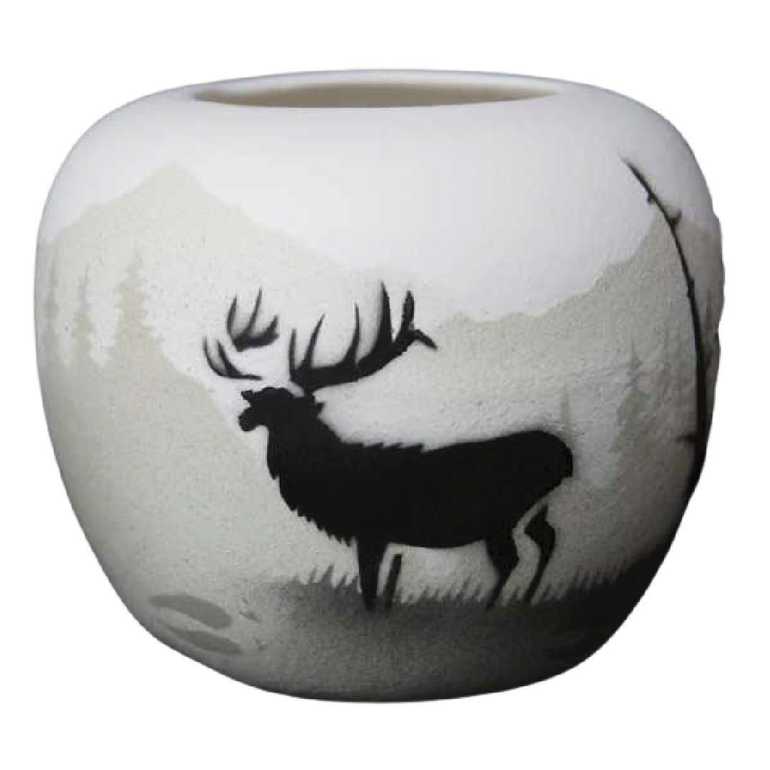 Soar with the eagle as he surveys majestic mountain peaks, meandering strems, conifer trees and wildlife. Sihoueetes of moose, wolf, bear, elk or buffalo are combined with their tracks that encircle the piece.