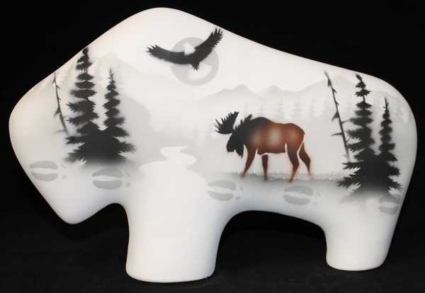 Soar with the eagle as he surveys majestic mountain peaks, meandering streams, conifer trees and wildlife. Silhouettes of moose, wolf, bear, elk or buffalo are combined with their tracks that encircle the piece.
