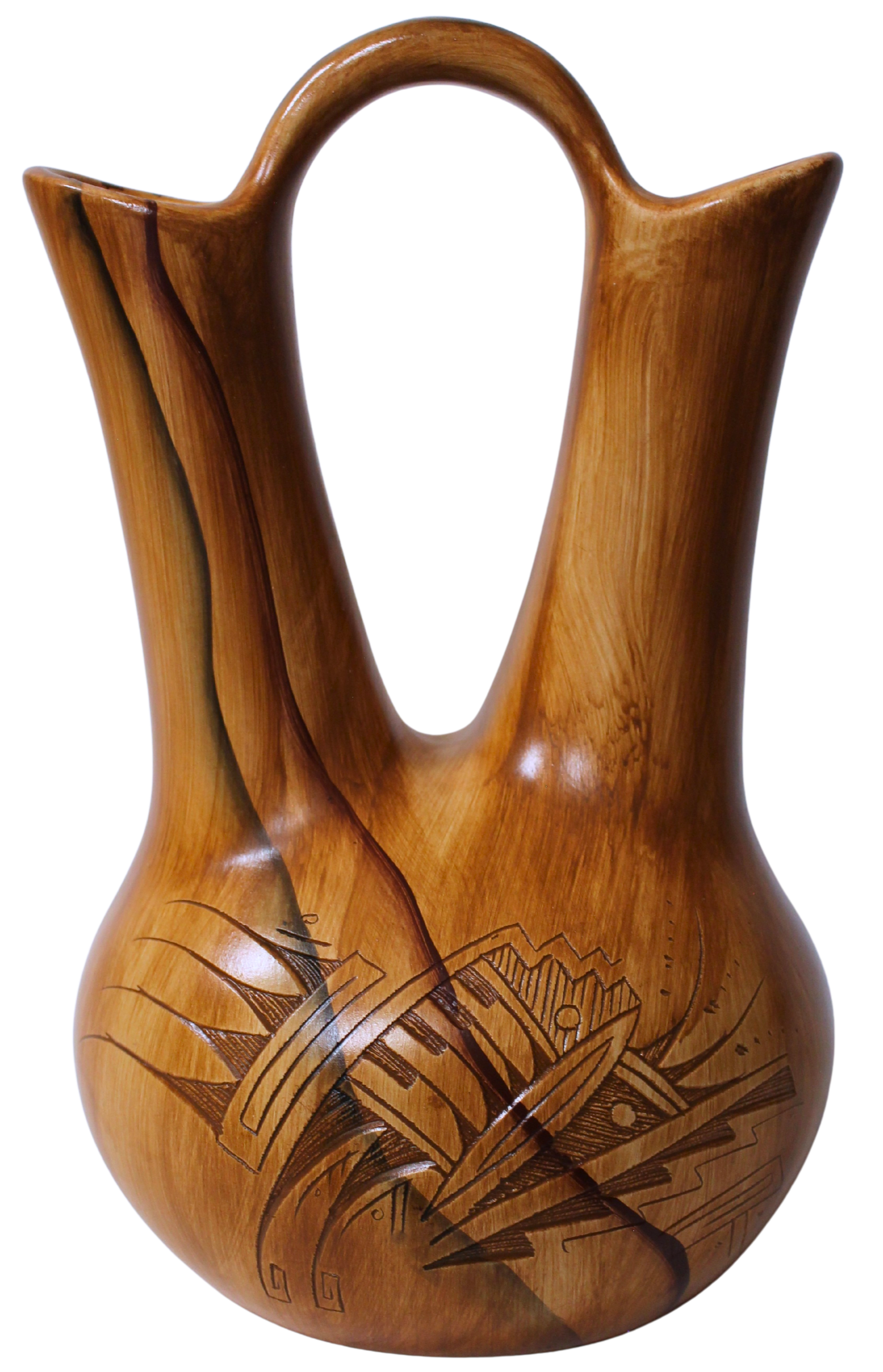 DWAYNE BLACKHORSE has done a variety of pottery styles but his specialty is this Woodgrain Finish. Green ware is etched, then fired and then streaked with the woodgrain pattern with turquoise accent on many of his pieces. Although many are similar each piece is unique.