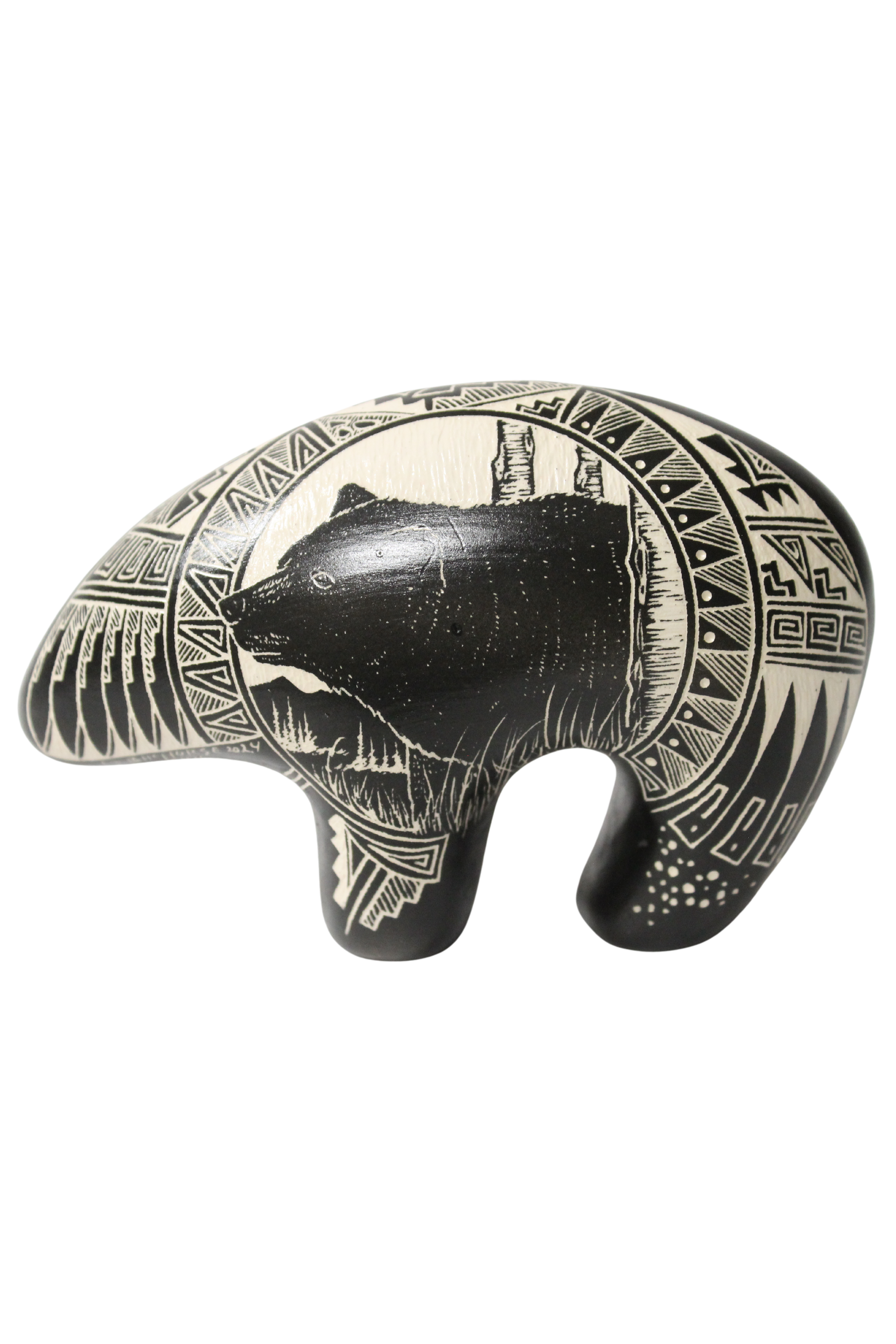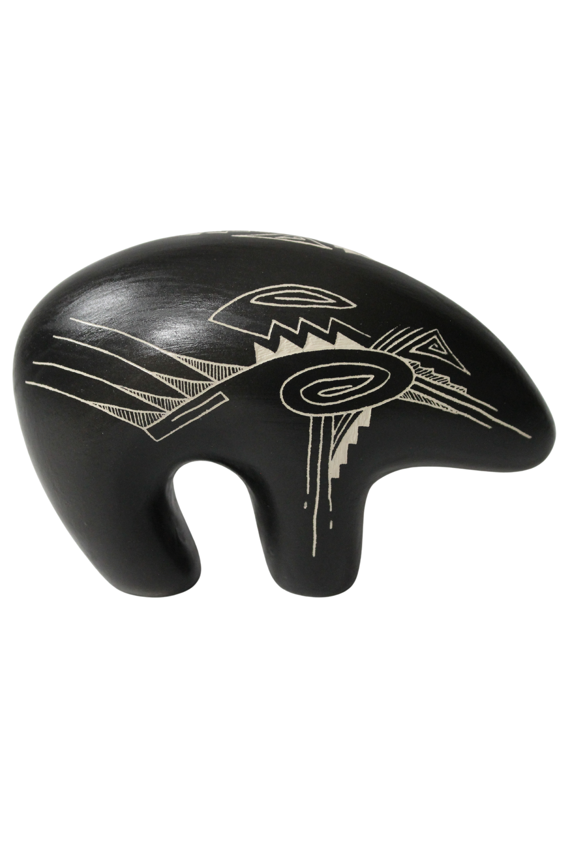 LEO BLACKHORSE specializes in ultra fine etching and two-tone etching. This Bear Figure gets you some of Leo's fantastic workmanship without the cost of two-tone etching or hand throwing. The contemporary geometric patterns draw on several traditional designs including feather, steps, rain and a variety of spiral shapes.